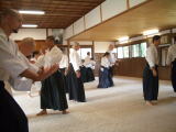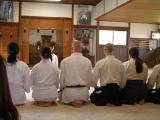 午前10時から11時まで磯山先生による指導がなされ私たちは玄関板の間から見学しました。15名のうち日本人は3名のみで後は外人の弟子ということでした。長い人で1年半くらいここに滞在するということでした。外人女性が1人、日本人(?)女性が2人いるように見受けられました。アメリカ、イギリス、ポ-ランド、オ-ストラリア、ミャンマ-等からきているとのことでした。合気道の国際性を身近に感じ取ることができました。宿舎は道場が当てられていて、特別の宿舎はありませんでした。